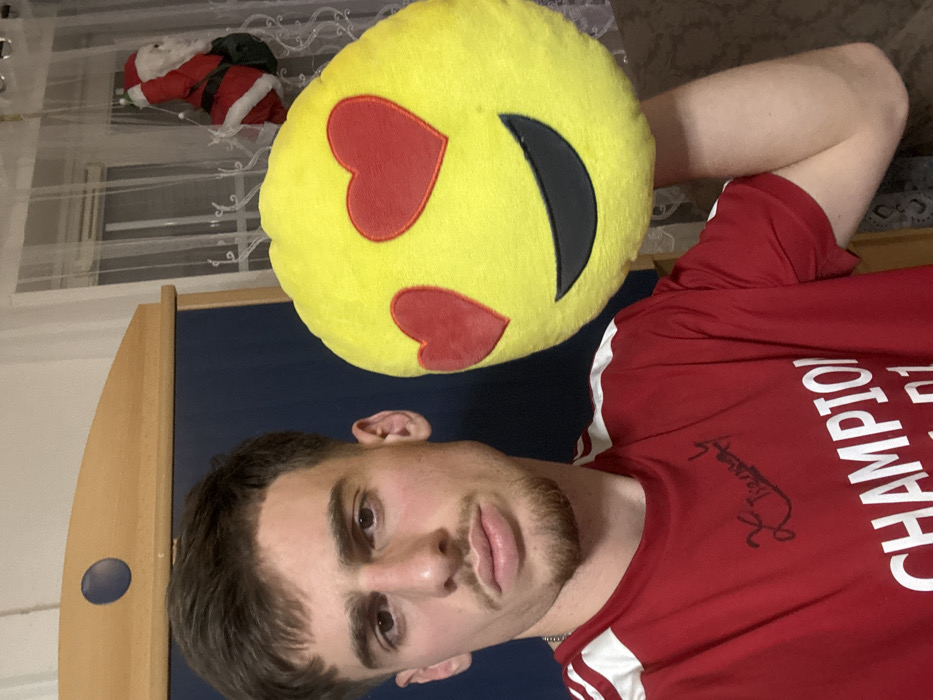 A young man with short brown hair and a trimmed beard poses in a red sports jersey with white accents and the word "CHAMPION" printed on it. He's holding a large, round, yellow emoji pillow with red heart eyes and a black curved mouth, positioned behind his head. A Santa Claus figurine sits on the window behind him. The photo has an indoor setting with what appears to be a bed frame on the left.