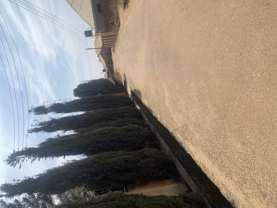 The image displays an empty residential street in Jos, Nigeria, under a bright, clear sky with scattered white clouds. The road surface is light brown and appears to be composed of gravel or a coarse aggregate. On the left side of the road, a continuous row of approximately ten tall, slender, dark green coniferous trees borders a low, dark grey concrete drainage channel or curb. A light-colored wall is partially visible behind these trees. On the right side of the road, the foreground consists of dry, uncultivated earth. Further along the road on the right, several residential buildings with light-colored, possibly corrugated metal or tiled gable roofs are visible, separated from the road by a brick or concrete fence. One prominent structure in the mid-ground on the right features a dark, elevated water tank. Overhead power lines traverse the upper portion of the sky. No people, vehicles, or specific activities are present in the scene.
