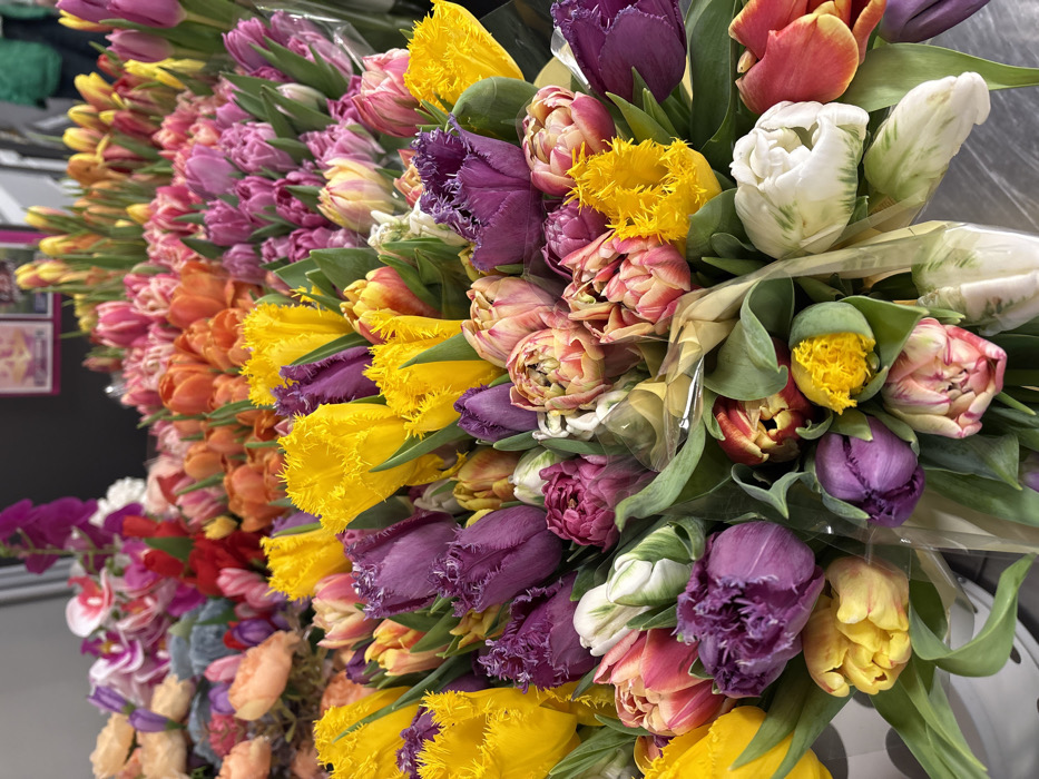 The image presents a close-up, high-angle view of a dense floral display within a flower shop or market located in Chaikovsky, Russia. The foreground and midground are dominated by numerous bunches of fresh tulips, exhibiting a wide range of colors including vibrant yellow, deep purple, various shades of pink, orange, red, and white. Several tulip varieties are present, notably fringed tulips (e.g., yellow, purple), double-flowered tulips (e.g., pink, orange), and standard tulip forms. Some individual bouquets are wrapped in clear plastic sleeves, indicating preparation for sale. In the blurred background, additional floral arrangements, including what appear to be artificial flowers and other natural blooms such as orchids, are visible on dark shelving or display units. A partially obscured human figure wearing a green top is faintly discernible in the distant background. The scene is illuminated by consistent indoor lighting. No active interactions or specific actions are occurring beyond the static presentation of flowers for commercial purposes.