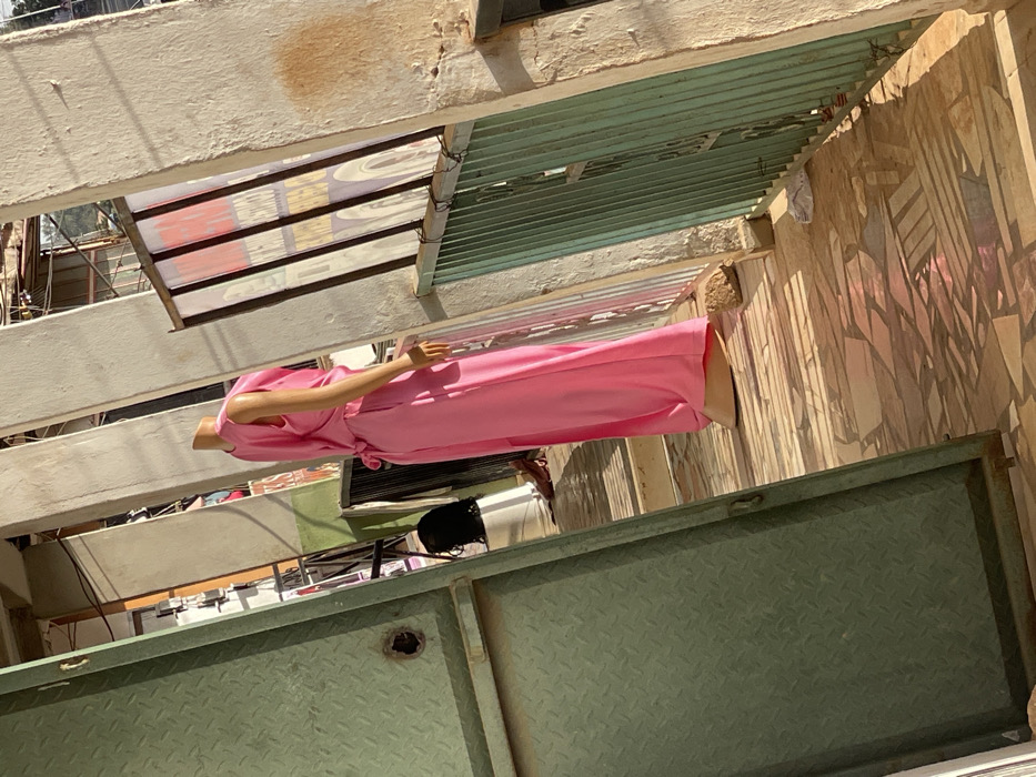 A pink, belted garment is displayed on a mannequin. The mannequin is on a sidewalk or concrete area near a building. It stands between the building and a dark green metal structure, possibly a gate or door. Above the mannequin, there are metal beams and a roof, suggesting the structure may be an awning or a covered walkway. The scene is bright with sunlight casting shadows.