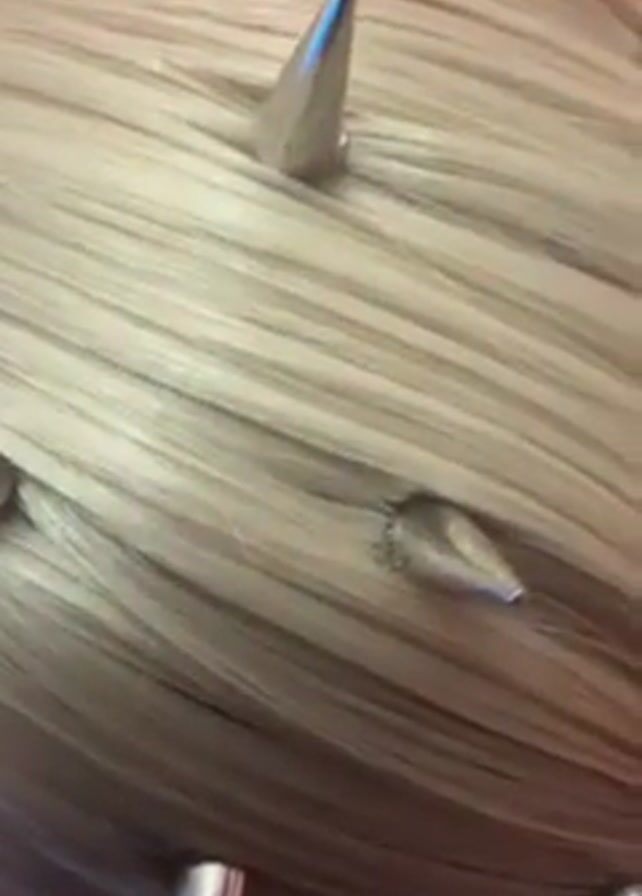 close up of a wig with silver spikes sticking out of the top. The wig is blonde and the spikes have a conical shape. The camera moves slightly, focusing on different spikes and sections of the wig.