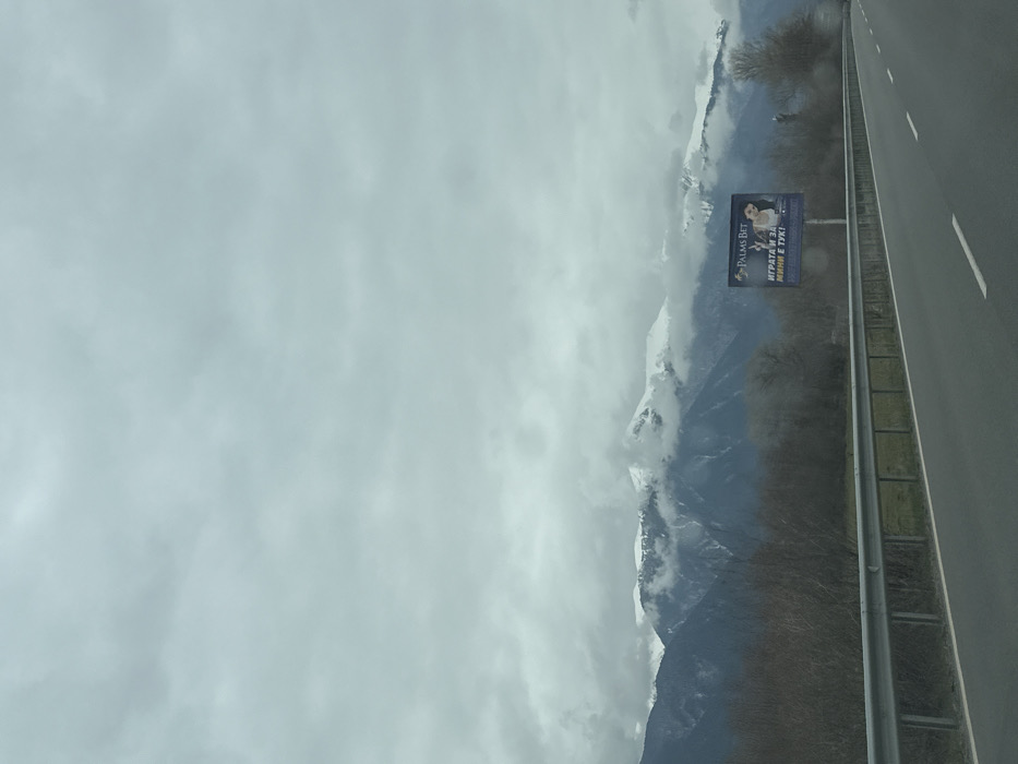 The image displays a panoramic landscape near Razlog, Bulgaria, under a heavily overcast sky. A two-lane asphalt road, marked with white lines, extends diagonally from the lower left to the right, suggesting a view from a moving vehicle. A metal guardrail runs parallel to the left edge of the road. Beyond the guardrail, a strip of sparse vegetation with bare trees and bushes is visible. In the mid-ground, to the right of the road, a large billboard advertises "PALMS BET" with Bulgarian text and an image of a woman. The background features a prominent mountain range with snow-capped peaks, partially enveloped by dense grey clouds. The lower slopes of the mountains are covered in dark green forestation and visible rock. No individuals or active subjects are discernible.