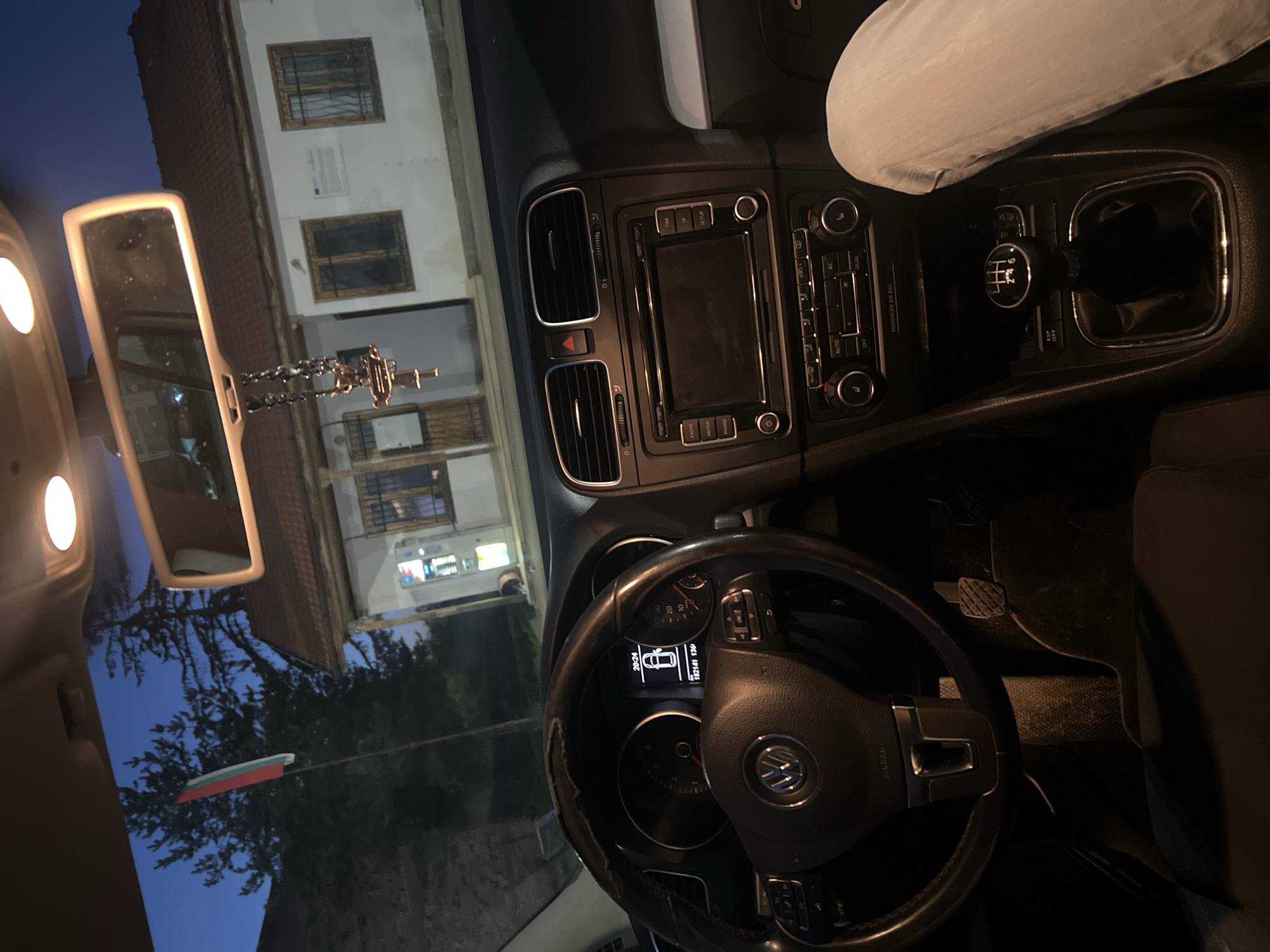 The image depicts the interior of a Volkswagen car, specifically the dashboard and steering wheel