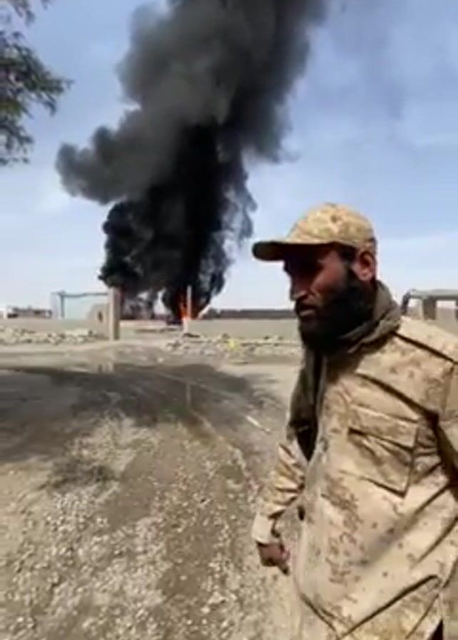 A large plume of black smoke rises into the air from a fire in the distance, beyond a gravel road and a low stone barrier. A person wearing camouflage gear and holding a rifle walks briefly into the frame on the left. The area appears to be an outdoor site with a building visible in the background. The sky is light blue with some clouds.