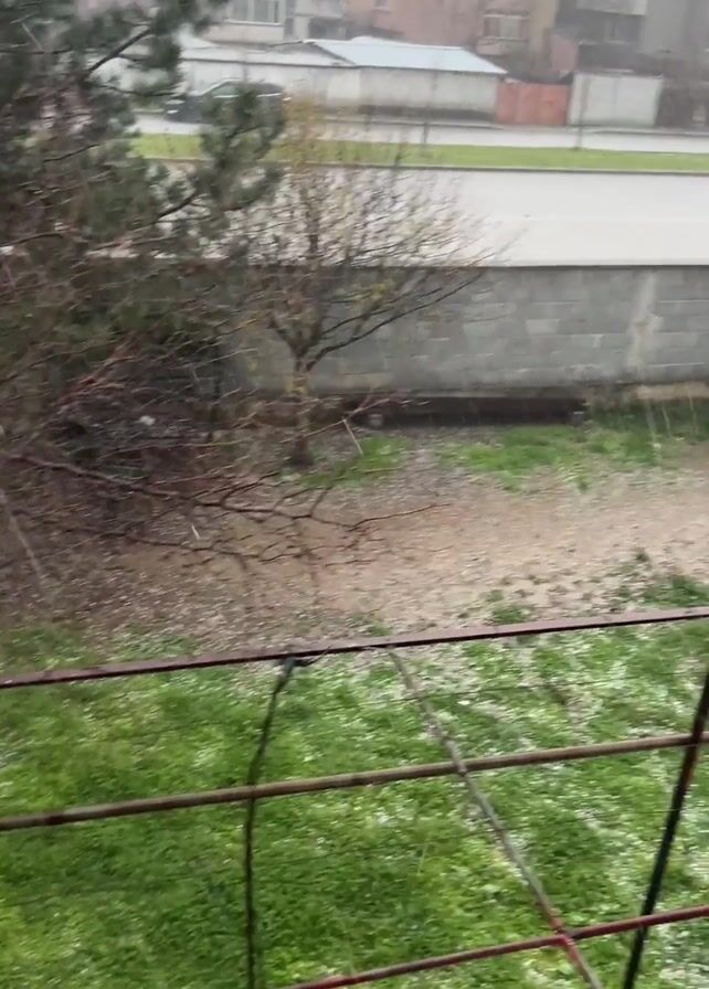 From a height, likely from a balcony, the scene captures a severe hailstorm