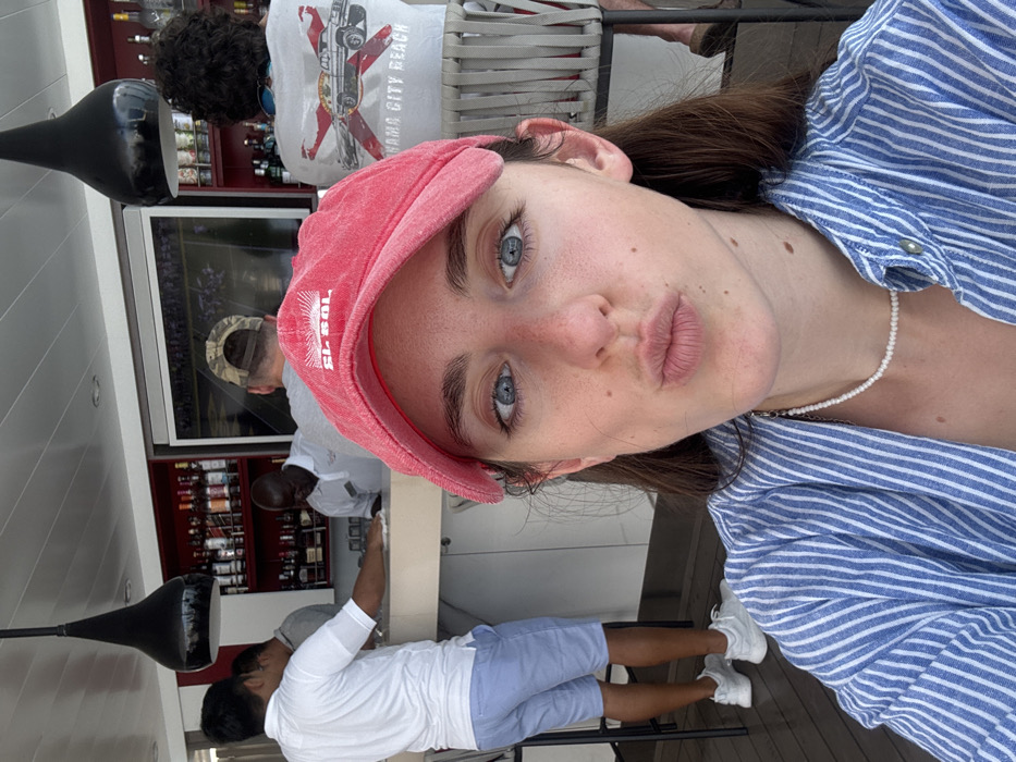 A woman in a blue-striped shirt and a red "El Sol" cap takes a selfie at a bar