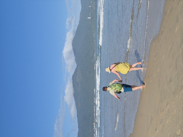 Two people walk on a beach at the water's edge. The person in front wears a light-colored shirt, blue shorts, and a green backpack. The second person wears a yellow dress and a straw hat. Mountains are in the background under a clear blue sky with wispy white clouds. The sand is light brown, and the water is a pale blue color with white surf.
