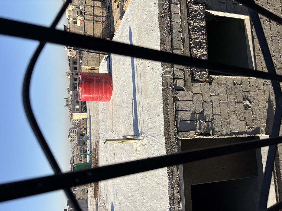 The image displays an urban rooftop scene in Mu'adammiyat ash-Sham, Syria, observed through a black, blurred metal grate in the immediate foreground. The central focus is a light-gray concrete roof slab, likely newly poured due to its uniform appearance and the presence of exposed rebar rods extending upwards from several concrete pillars. On this main concrete roof, a large, cylindrical, red plastic water tank is prominently situated in the mid-right. To the left, another green cylindrical plastic water tank is visible, along with scattered piles of rebar and other construction materials. A small, white satellite dish is positioned further back on the same roof. Below the main roof level, partially obscured by the grate, are unfinished building walls constructed from gray concrete blocks, featuring open apertures that indicate uncompleted windows or doorways. The background reveals a dense urban landscape characterized by numerous multi-story buildings, predominantly light-colored. Many distant rooftops feature additional structures, smaller water tanks, and satellite dishes. The sky is clear and bright blue, with strong sunlight casting distinct, elongated shadows across the rooftops and structures. No people, active movements, or explicit interactions are visible within the scene.