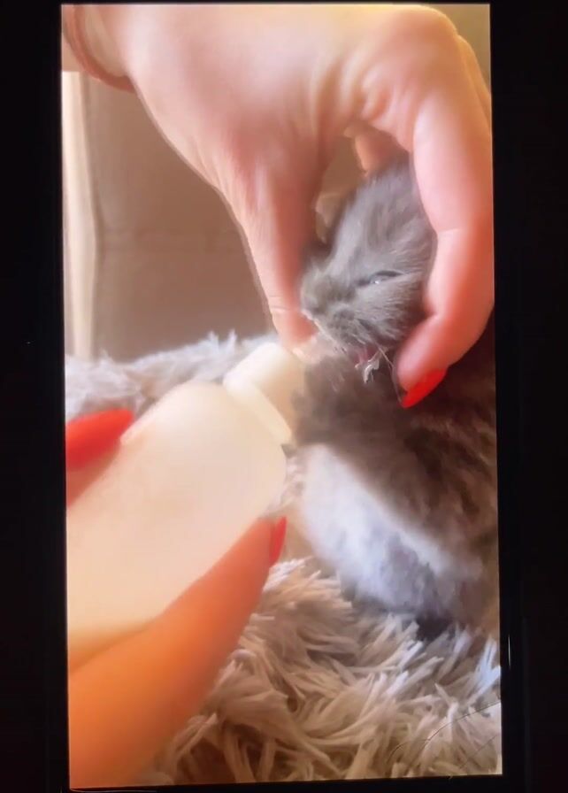 A hand with red fingernails is shown feeding a tiny gray kitten from a small white bottle. The kitten is surrounded by a fluffy, light-colored blanket or rug. The kitten appears to be inside a cardboard box. The kitten makes small squeaking sounds while it is being fed.
