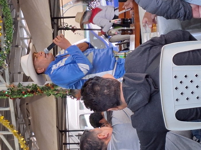 The image depicts a man in a white hat and blue jacket holding a microphone and speaking into it. He is standing and looking to his right, facing the audience. The scene is an outdoor event in Socabaya, Peru, at the coordinates provided. The man is speaking to a group of people sitting at a table. The table is set with a glass of beer and some bottles on it. The setting includes a white canopy tent and some other unidentified objects in the background. The image shows a man seated behind the speaker, with a woman in a floral shirt partially visible in the background. The scene is lively and celebratory. The man is engaging the audience with his speech. The environment is casual and friendly. The image suggests a social gathering of a group of friends and family.