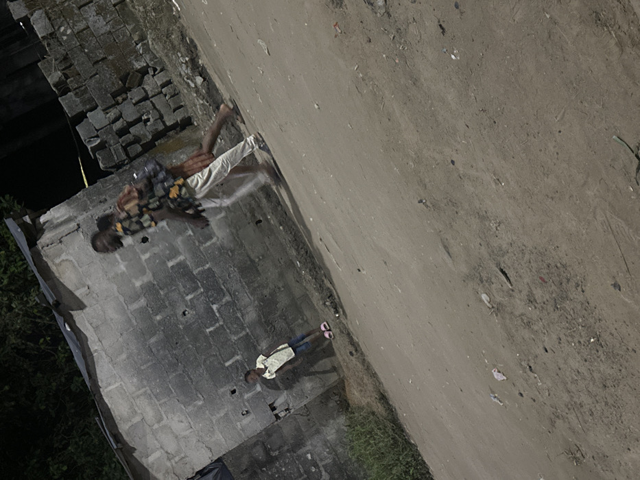 Two people stand near a low brick wall at night. One is an adult wearing a patterned shirt and light pants, seemingly standing on the wall. A child in light-colored clothing stands further away, near the ground. The area around the wall is a mix of concrete and sandy soil. Vegetation appears near the bottom of the frame. The scene is dimly lit, casting long shadows.