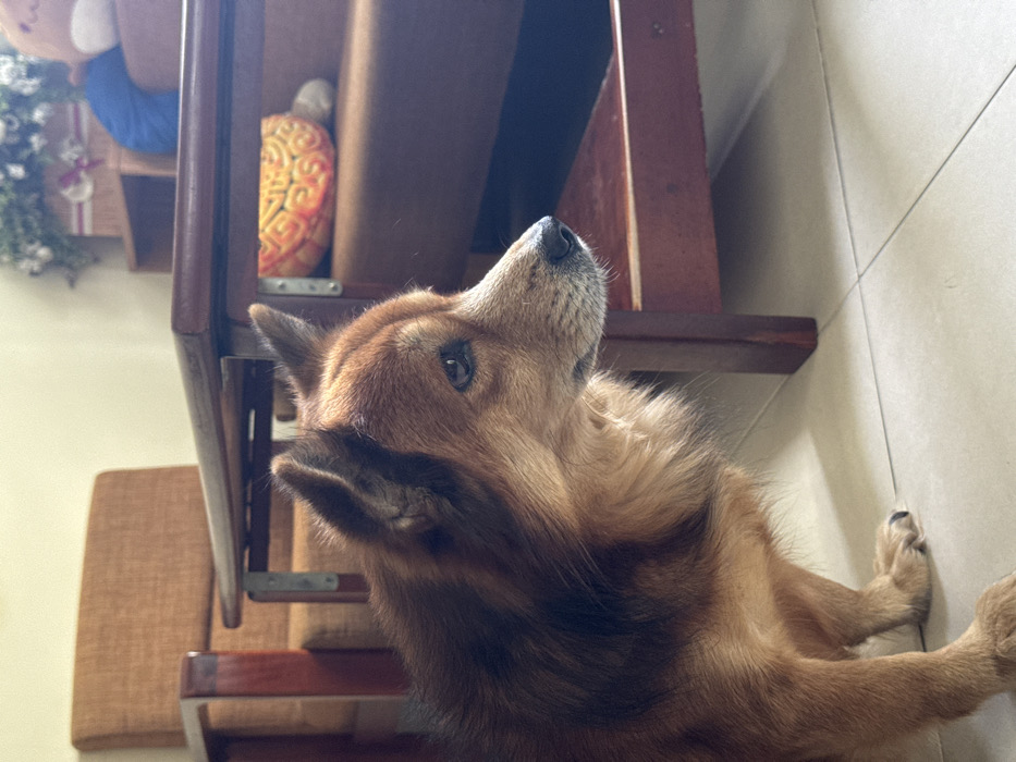 A tan and brown dog is looking upward with a slightly tilted head. The dog's face is in focus with the rest of its body slightly blurred. The dog is near a set of wooden steps with a tile floor to the right. A chair is near the steps. A decoration and a stuffed animal are partially visible behind the steps.