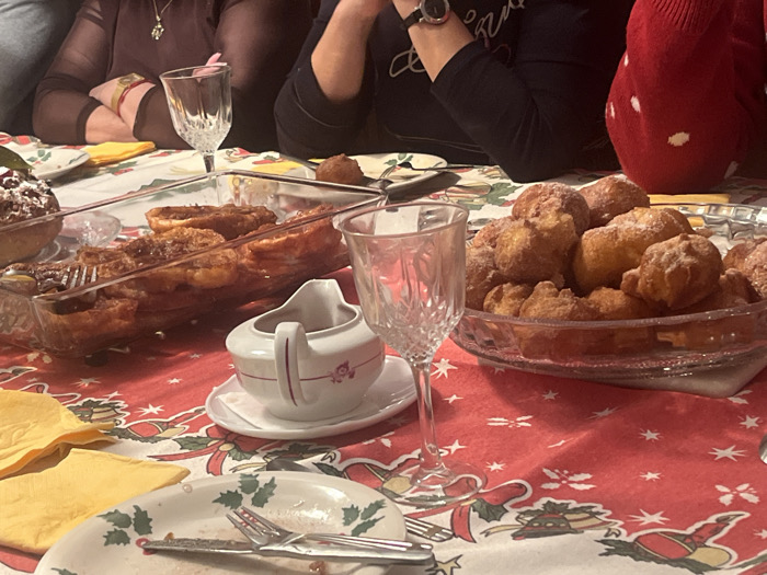 A festive table laden with food. A clear dish with golden pastries sits on the right, next to a glass. To the left is a rectangular glass pan filled with similar pastries. A white gravy boat with a floral design rests on a saucer. A partially eaten plate with utensils lies in the foreground. The tablecloth features a Christmas-themed pattern. People sit around the table.