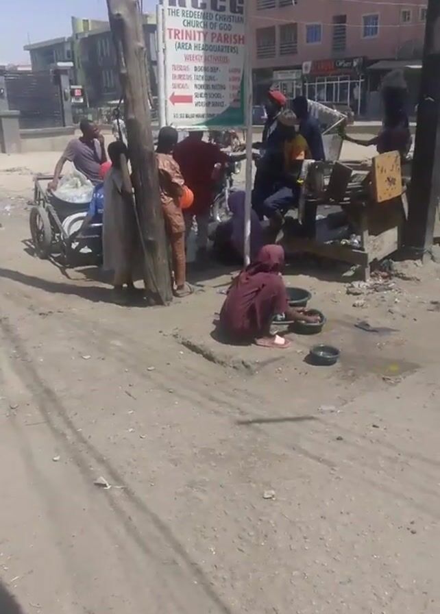 A dirt road scene shows several people gathered around a makeshift area where food or other items are being prepared. There's a woman kneeling on the ground near three basins, seemingly cleaning or preparing something within them. A few people are standing nearby, and some are sitting. In the background, there is a cart and a parked motorcycle. A banner of a religious organization is seen attached to a building, indicating a church in the vicinity. The overall environment appears to be somewhat run-down or underdeveloped.
