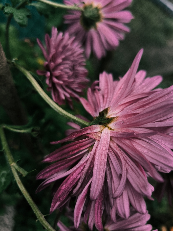 The image displays a close-up view of multiple blooming chrysanthemum flowers in an outdoor environment in Parkhomivka, Ukraine. The primary subject is a large, vibrant pink-to-purple chrysanthemum positioned in the lower right foreground, rendered in sharp focus. Its numerous ray florets are clearly visible, and many are covered with distinct water droplets. The underside of the flower head is partially exposed, revealing its structure. To the upper left of the foreground flower, a second, smaller chrysanthemum with darker pink/purple petals is present in the mid-ground, appearing softer due to a shallow depth of field. A third, partially visible chrysanthemum, also pink/purple with a green central disc, is located in the upper background, completely out of focus. Green stems and blurred green foliage constitute the background elements. No human or animal subjects are present. The scene indicates recent exposure to precipitation or dew, evidenced by the water droplets on the petals.