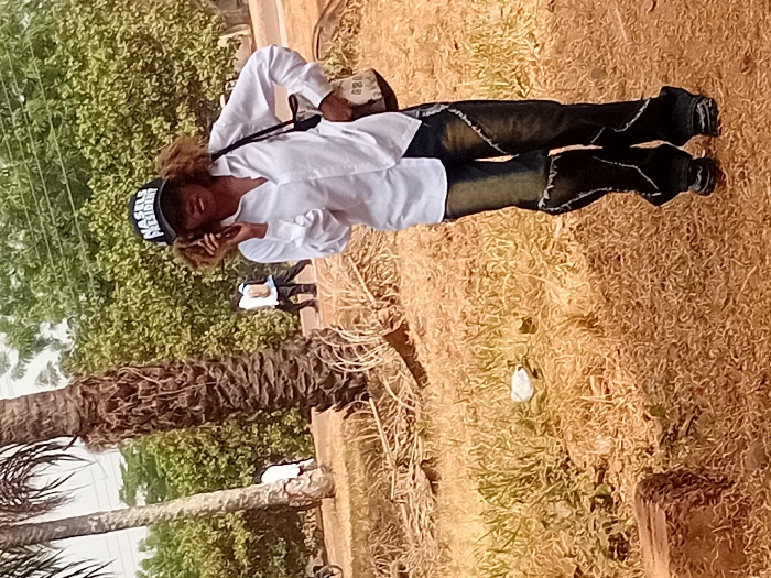 This image depicts an outdoor scene in the city of Ayangba, Nigeria, under daylight conditions. The primary subject is a person, positioned centrally in the foreground, facing slightly right but looking towards the viewer. This individual has light brown, curly hair and wears a black baseball cap with "NASELS PRESIDENT" written in white uppercase letters on the front. They are dressed in a loose-fitting white long-sleeved button-up shirt and baggy dark blue jeans with distressed areas and visible white stitching, particularly on the lower legs. Dark-colored shoes are visible on their feet. The subject holds a dark-colored smartphone to their right ear with their right hand, appearing to be engaged in a phone call. Their left hand is placed on their left hip, and a light-colored shoulder bag with dark markings hangs from their left shoulder. In the mid-ground, to the left of the main subject, are two tall palm trees with rough, textured trunks. Behind these trees and further down a dirt path, two additional individuals are visible. One person wears a white shirt, and the other wears a dark shirt and dark trousers, carrying a light-colored backpack. Both appear to be walking to the left. The ground in the foreground and mid-ground is covered with dry, light brown grass and scattered dry plant debris, interspersed with some patches of lighter green vegetation. A small, light-colored piece of discarded material (possibly plastic or paper) is visible on the ground in the lower-left quadrant, near a small, dark-colored wooden block or stump. Dense green foliage, likely consisting of trees and bushes, forms the backdrop in the far distance. A dirt road or path is discernible behind the main subject and the foreground trees. The scene is brightly lit, indicative of clear weather.