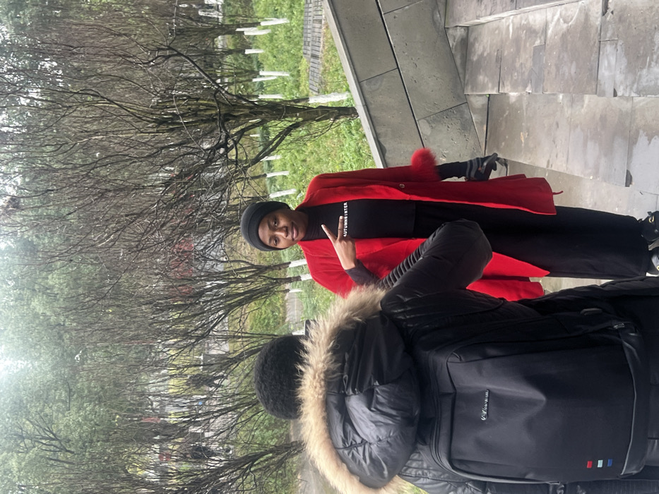 Two people stand outside on a cloudy day. One person wears a black beanie, a black shirt, and a red coat with fur trim. They are giving a peace sign. The other person is wearing a black puffy jacket with a fur-lined hood and a backpack. In the background are trees without leaves and white markers. The scene is somewhat wet or damp.