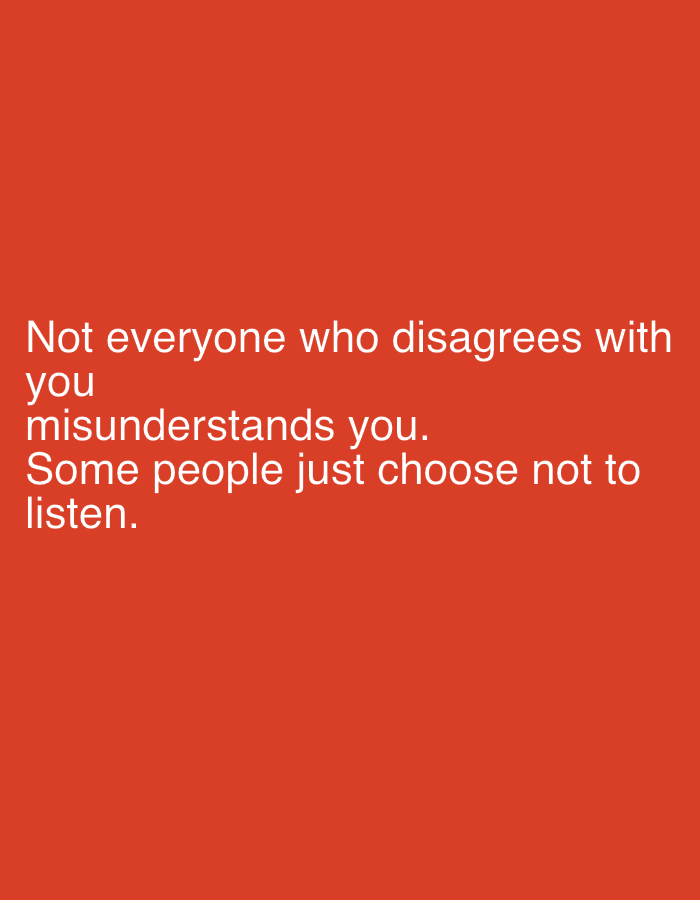 This image, located in the city of Dehqonbozor, Uzbekistan, displays white sans-serif text against a solid red background. The text reads: 'Not everyone who disagrees with you misunderstands you. Some people just choose not to listen.' The five lines of text are centrally aligned on the red field. No people, physical objects, actions, or discernible environmental features are depicted within the image's visual content.