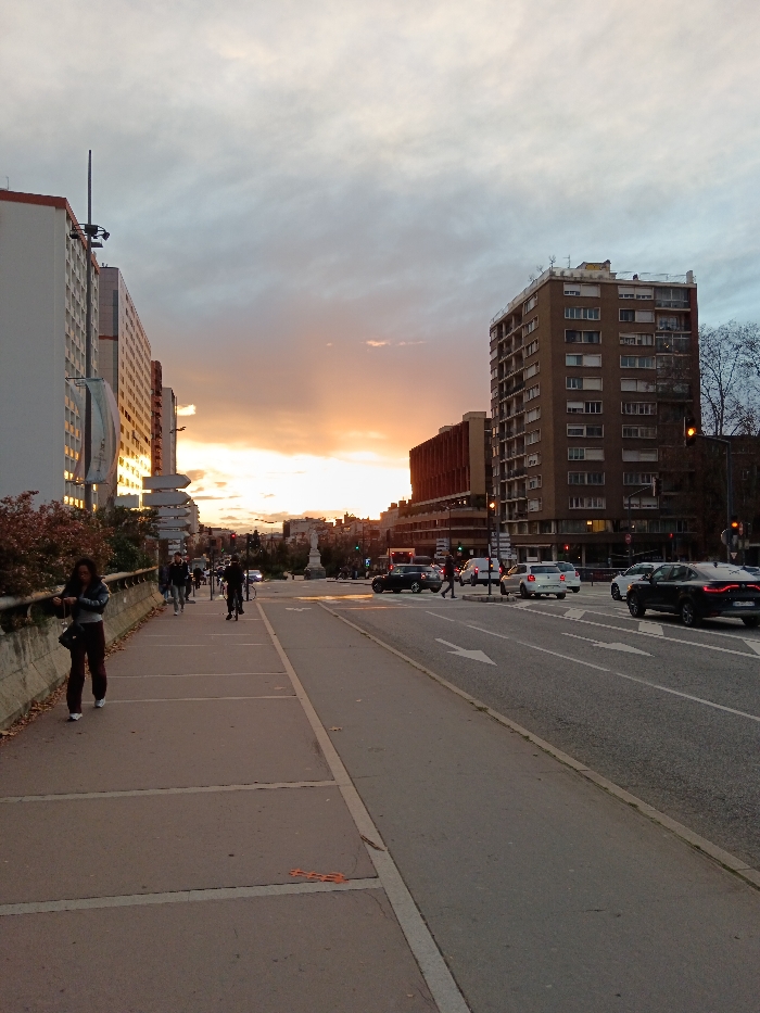 - "An urban scene at sunset features pedestrians on a wide sidewalk alongside a busy street" by FM-nAU183, licensed under CC BY 4.0