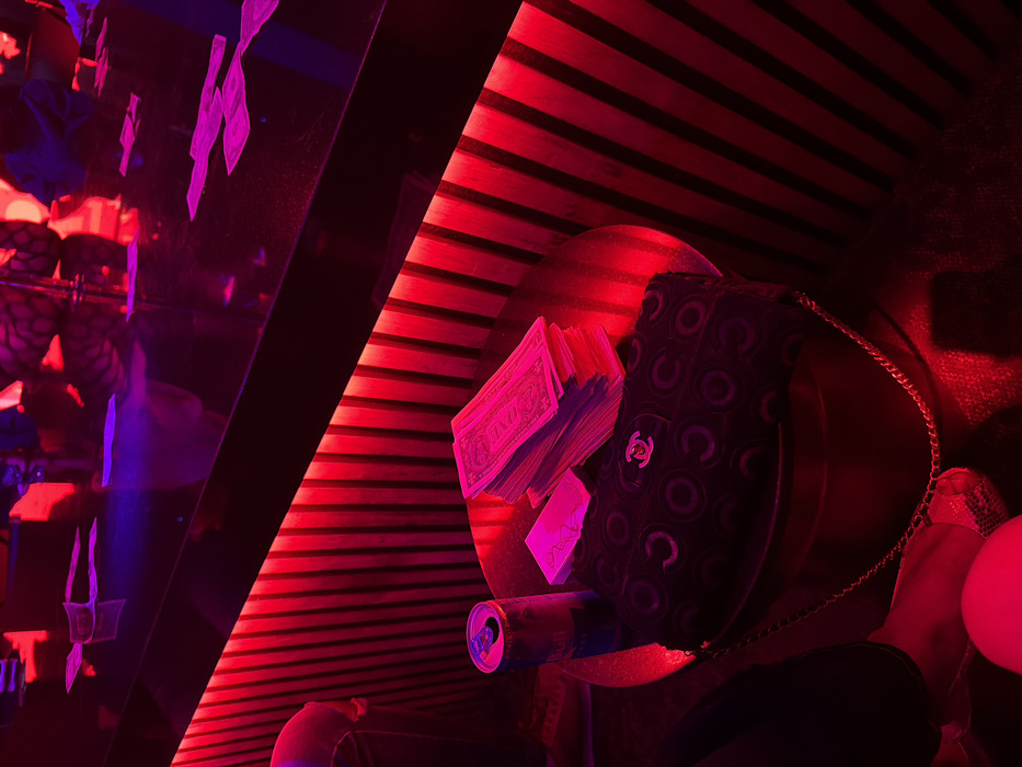 A scene awash in red light reveals a small round table. Atop it rests a thick stack of one-dollar bills, a designer purse with a silver chain, an open soda can, and a business card. Fragmented money hangs decoratively against a black wall illuminated with purple light. A striped background creates a linear depth to the composition. A person's foot with a light-colored shoe and pink balloon adds a human element.