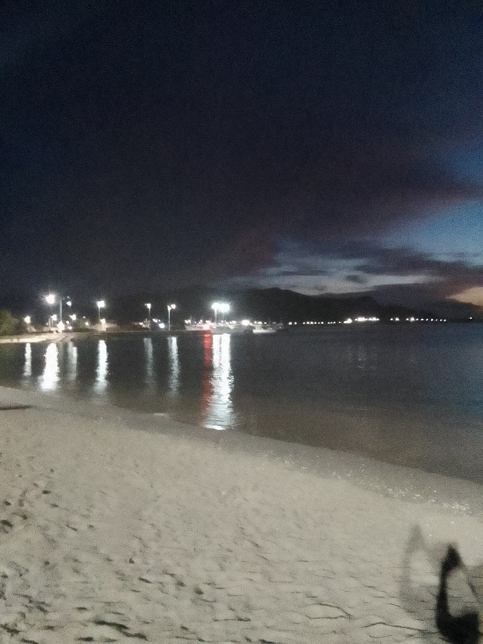 The image captures a nighttime coastal scene in Juan Griego, Venezuela. The foreground consists of a light-colored sandy beach, exhibiting footprints and surface textures. A dark, indistinct shadow is present on the sand in the lower right quadrant. The midground features a calm body of water, reflecting numerous artificial lights from the distant shore as elongated vertical streaks of white and red illumination. In the background, a line of bright white and intermittent red lights delineates a developed distant shoreline. Dark silhouettes, consistent with boats or vessels, are visible in the water near this illuminated shore. Behind the distant lights, a dark mountain range or hills are silhouetted against a dark blue-black sky. Faint cloud formations are visible, with a subtle lighter hue near the horizon on the right. No individuals or specific actions are explicitly depicted.