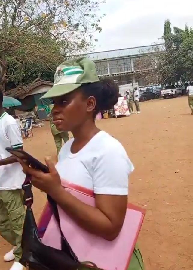 wide outdoor shot of a dirt ground with people wearing National Youth Service Corps (NYSC) uniforms, white shirts and khaki pants, walking around. In the background there are cars parked, trees, a building, and small market stalls set up. A woman in the foreground, also wearing an NYSC uniform, is holding a phone. Some of the people are carrying bags. The sky is overcast.