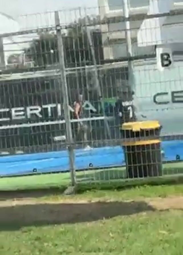 group of people playing padel tennis on an outdoor court. The court is enclosed by a wire fence. A yellow and black trash can stands near the fence. The court has a blue border and green surface. Outside the court, there is green grass. The video shifts perspective and is shot from under a blue beach umbrella. Buildings are visible in the background.