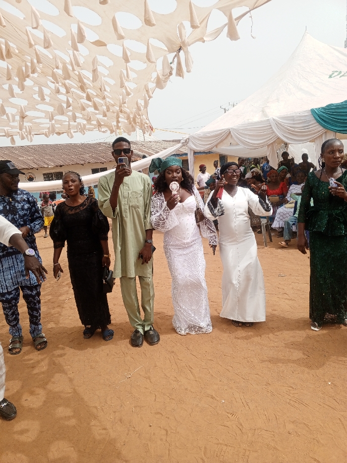 An outdoor scene in Akwanga, Nigeria, depicts a gathering under a decorative white fabric canopy and a larger white event tent