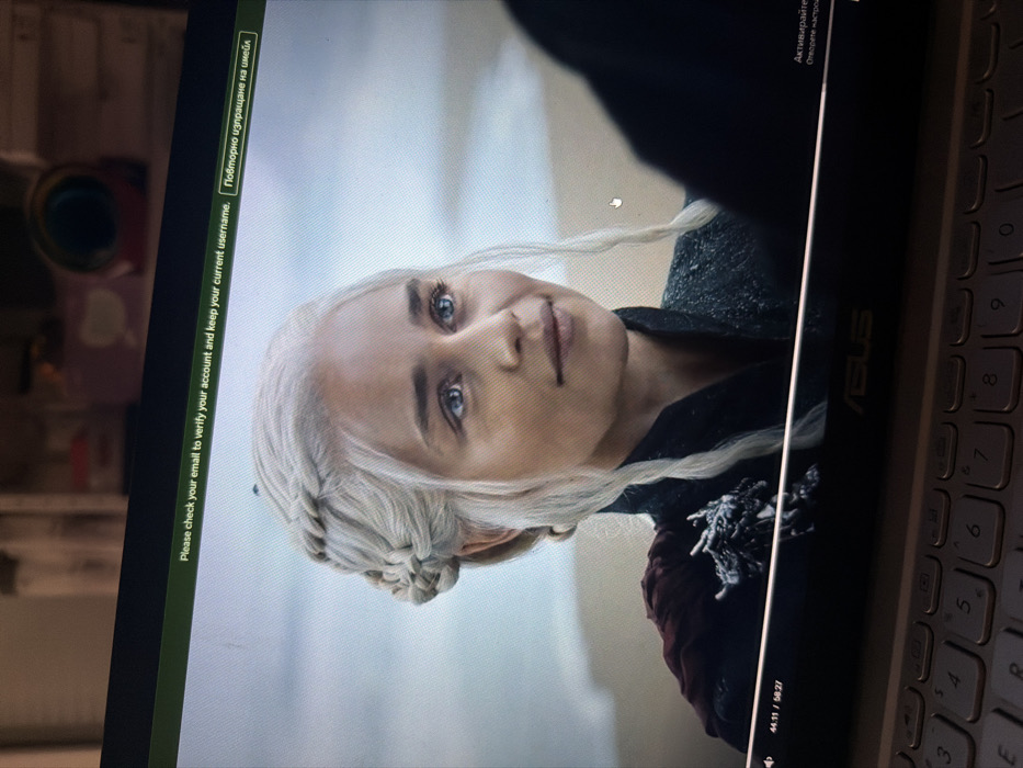 The image displays a close-up view of an ASUS laptop screen in an indoor setting in Dimitrovgrad, Bulgaria. The screen presents a video frame featuring a woman identified as Daenerys Targaryen from Game of Thrones. She has platinum blonde hair styled in braids, blue eyes, and a subtle smile, looking slightly upwards and to the right. She is dressed in dark attire, accessorized with a detailed, dragon-like broach on her left shoulder and a dark red drape. The video's background is a blurred, light-toned outdoor scene, possibly a beach or sky. Several on-screen user interface elements are visible: A green banner at the top contains the English text "Please check your email to verify your account and keep your current username." alongside the Bulgarian phrase "Повторно изпращане на имейл" (Re-send email). A video playback bar at the bottom indicates the progress "44:11 / 58:27", with other video controls partially discernible. In the bottom right corner, Bulgarian text prompts "Активирайте" (Activate) and "Отворете настройки" (Open settings). A portion of the laptop's silver-toned QWERTY keyboard is visible at the bottom of the physical image. The background behind the laptop is out of focus, showing indistinct shapes on what appears to be a shelf or cabinet in dim lighting.