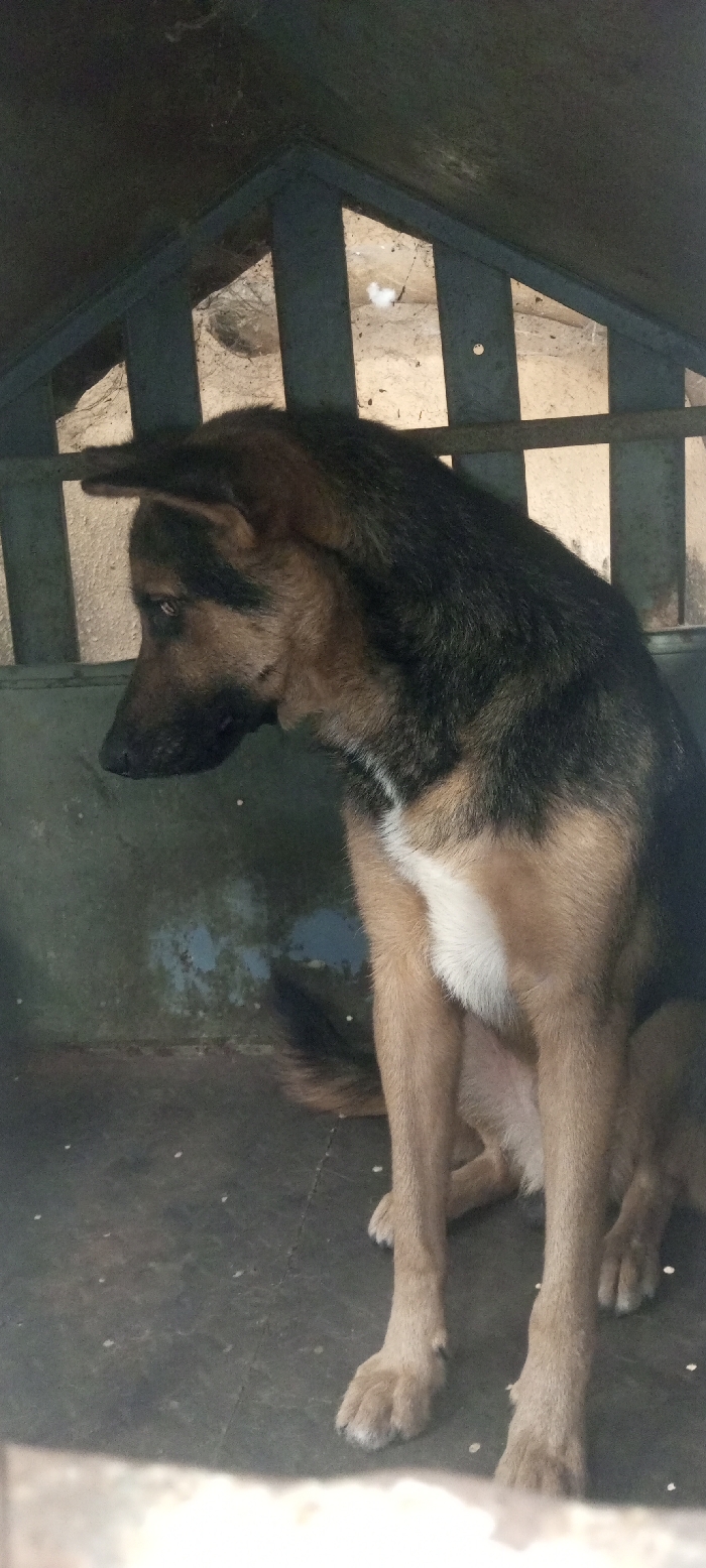 An adult canine, appearing to be a German Shepherd mix, is depicted seated within a confined structure