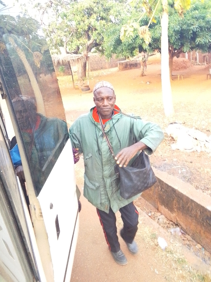The image captures an outdoor scene in Emabo, Nigeria. An adult male, of dark complexion, stands centrally, positioned near the open passenger door of a white vehicle, likely a bus or large van, which occupies the left side of the frame. The male wears a light green utility jacket over a visible red undershirt or collar, black trousers with a red vertical stripe, black shoes, and a light-colored, patterned cap. He holds a dark, checkered shoulder bag in his left hand, with the strap draped across his chest. His gaze is directed towards the viewer, with a slight smile. A reflection of the male and the background is visible on the vehicle's dark window. Inside the vehicle, a person's arm with a blue sleeve is partially visible. The ground consists of reddish-brown compacted earth. A low, dark concrete curb or wall runs along the right side of the frame. The background features various trees with green foliage, a structure with a thatched roof, a prominent light-colored papaya tree, and several clay-colored structures or walls, including a large mud mound. A discarded tire is visible near a tree in the mid-distance. The scene is lit by natural daylight.