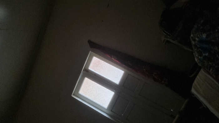 The image depicts an interior scene, likely a room within the city of Yangi-Khayat, Uzbekistan, characterized by dim lighting. A white double door or window unit is prominently positioned in the upper-left portion of the frame, serving as the primary light source. Each panel of this unit contains a large, rectangular pane of frosted or patterned glass, through which diffused daylight is visible. The surrounding walls and ceiling are dark gray, with a visible seam along the ceiling-wall junction in the upper-right. To the immediate right of the window/door, a dark, vertically oriented object, possibly a rolled-up rug with visible red and dark patterns, leans against the wall. The lower-right portion of the image contains indistinct dark shapes, consistent with furniture or stacked items, largely obscured by shadow. In the bottom-left corner, a section of lighter-colored bedding or fabric is visible, partially covered by a darker, patterned blanket or quilt with shades of blue and white. No individuals are present, and no actions or interactions are depicted. The perspective is from a low angle, slightly tilted.
