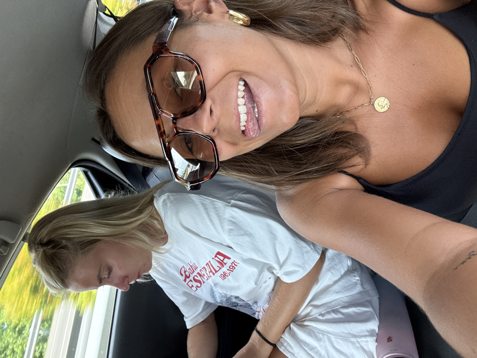 Two women pose in a selfie, seemingly inside a car. One woman is blonde and wearing a white t-shirt with the words "Bahia ESPAÑA 1961-1971" printed on it. The other woman, holding the camera, has brown hair, sunglasses perched on her head, a gold coin necklace, and a black tank top. She is smiling with her tongue slightly out. They are sitting inside the car.