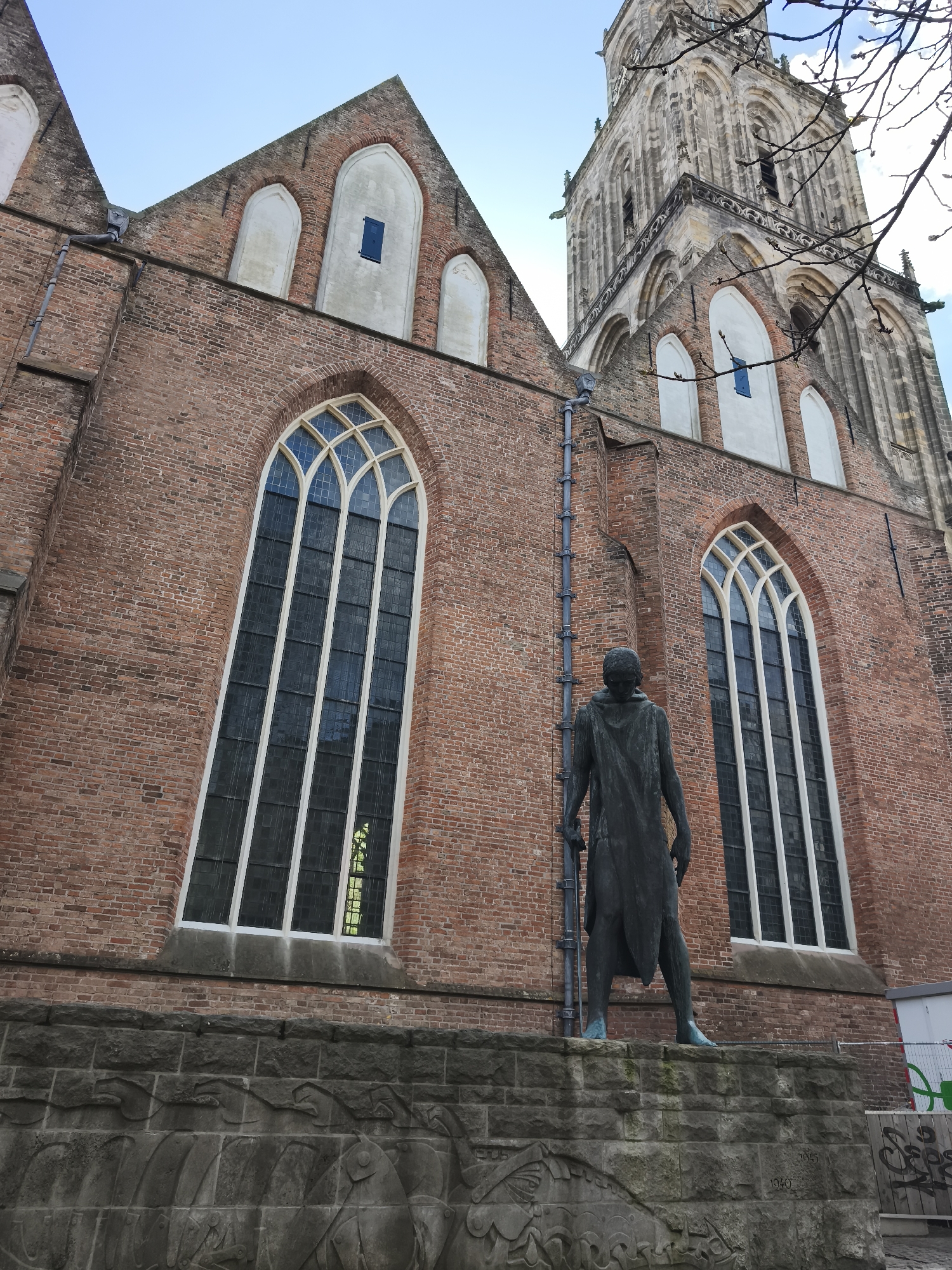 The image depicts a low-angle view of the Martinikerk (Martini Church) in Groningen, Netherlands, with a prominent statue in the foreground. In the immediate foreground, a dark, patinated bronze statue of a male figure stands atop a multi-tiered grey stone plinth. The figure is clad in a long, draped garment, with his head slightly bowed. His bare feet are visible, exhibiting a blue-green patina. The plinth features carved bas-reliefs depicting abstract or symbolic forms along its lower section. Faint numerals, specifically "1940" and "1945," are etched into the plinth's surface on the right side. Behind the statue, the brick facade of the Martinikerk rises. The church is constructed primarily of red brick with lighter stone accents, particularly around its numerous tall, arched Gothic windows. These windows feature intricate tracery in their upper sections and dark panes that reflect elements of the sky and faint greenery. A vertical metal downspout runs along the brick wall to the left of the statue. Higher on the facade, several blind arches and a smaller rectangular window with a dark blue shutter are visible. To the right of the main facade, the upper, multi-tiered sections of the church's stone tower are prominent, displaying intricate Gothic architecture with arched openings and decorative elements. Bare tree branches extend into the frame from the upper right, partially obscuring the tower. The sky above is light blue with scattered white clouds. To the far right, partially visible behind the statue's plinth, is a white construction barrier or hoarding with green markings.