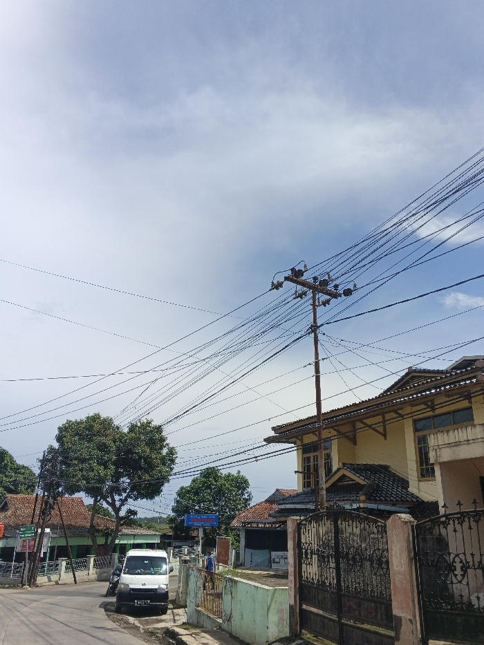 A street scene shows a two-story yellow house with a dark roof behind an ornate black gate. A utility pole laden with wires dominates the view, connecting to the house. Across the street are trees and a building with a red tile roof. A white van is parked on the side of the road. Above, a partly cloudy sky fills much of the frame.