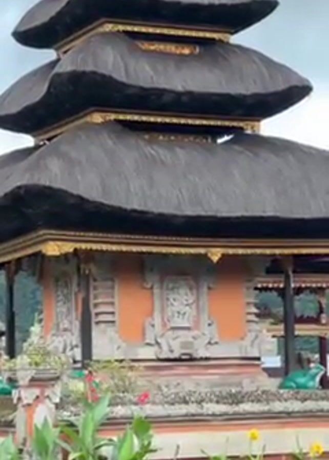 The video pans up to show the top of a tall, tiered temple. The temple structure is orange with ornate carvings, and the tiered roofs are made of dark, thatched material edged in gold trim. The camera moves upwards to show the multiple layers of the thatched roof, reaching a point in the sky where the overcast sky can be seen. In the foreground, there is a small, well-manicured garden with green plants and flowers.