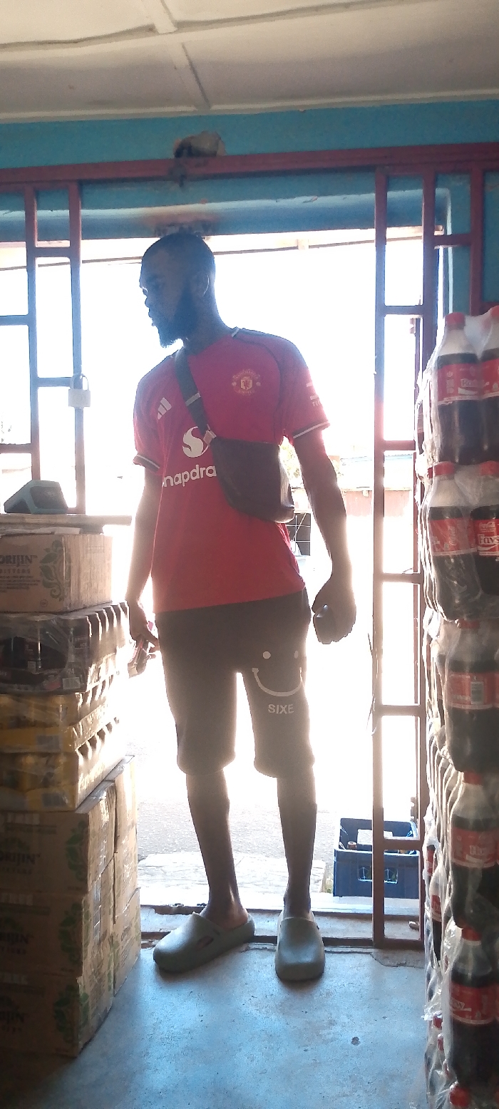 A male individual stands in the doorway of what appears to be a retail or storage establishment in Jos, Nigeria. He is partially silhouetted by bright outdoor light. The man has a beard and is wearing a red short-sleeved t-shirt featuring a Manchester United crest, "Santander," and "Snapdragon" logos. He wears dark shorts with a white smiley face and "SIXE" text, and light grey slip-on shoes. A dark brown sling bag is worn across his chest. His right hand appears to be holding a small, indistinct item. To the immediate left of the individual, a stack of cardboard boxes is visible, some labeled "ORIJIIN" with a green leaf logo. Below these boxes are clear plastic-wrapped packages containing beverages. To the immediate right, a tall stack of clear plastic-wrapped Coca-Cola bottles is present. The doorway is framed by light blue painted walls and a wooden beam, with an unidentifiable object resting on the beam. The floor is concrete. Beyond the doorway, a blue plastic crate is visible on the ground.