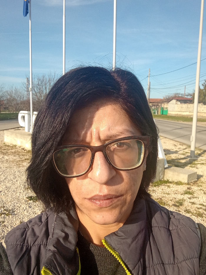 An adult female is depicted in a close-up, frontal view, centered in the foreground, outdoors in Alfatar, Bulgaria