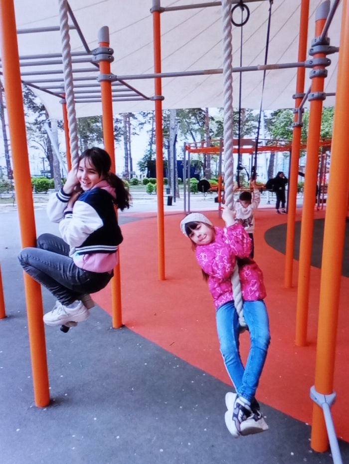 This image depicts an outdoor recreational area in Wilkszyn, Poland, under daylight conditions. A white fabric canopy partially covers a structure consisting of multiple vertical orange poles and horizontal grey bars. In the foreground, two female individuals are engaged with the equipment. On the left, an adolescent-aged female with dark hair wears a white varsity-style jacket with blue sleeves and black trim over a pink layer, dark grey jeans, and white athletic shoes. She is positioned in a partial squat, gripping an orange pole with her left hand, while her right foot rests on a dark, circular footrest attached to the pole. Her head is turned towards the camera, displaying a smile. On the right, a younger female child wears a bright pink patterned winter jacket, blue jeans, and white, black, and tan athletic shoes. She is holding onto a thick, twisted white rope suspended from the overhead structure, appearing to hang or swing. Her head is also turned towards the camera, and she is smiling. The ground beneath the subjects is a rubberized safety surface, distinctly sectioned into a reddish-orange area on the right and a dark grey area on the left. In the mid-ground, another child is visible interacting with a separate suspended rope, and an adult figure in dark clothing stands further back. The background features green trees and additional playground or exercise apparatus.