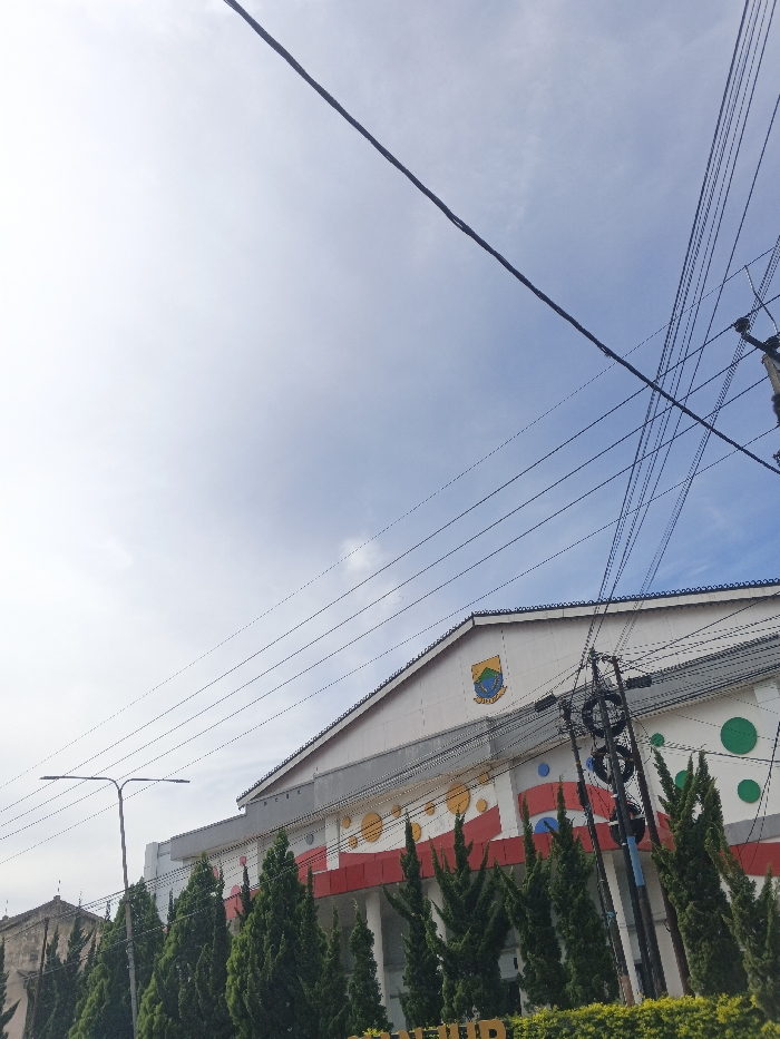 A white building with a gabled roof is seen under a blue sky streaked with thin clouds. A coat of arms is visible on the gable end. The building's facade features red trim and colorful circular accents. Evergreen trees line the base of the building. Power lines intersect the sky, obscuring parts of the building and sky. A light post is on the left. The composition is a low-angle shot.