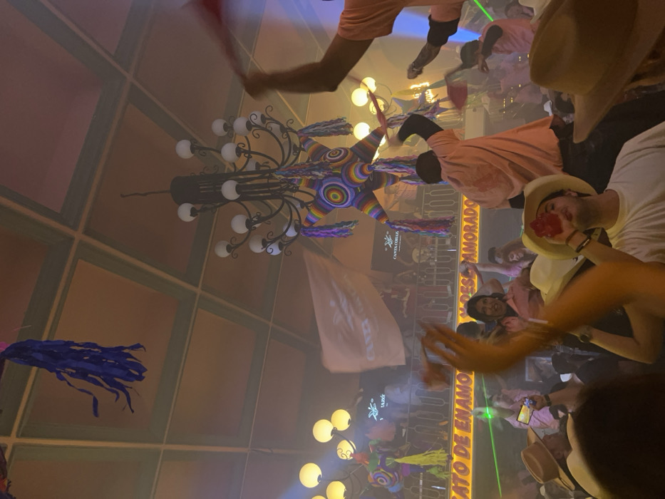 A vibrant scene unfolds indoors, with a large, colorful piñata suspended from the ceiling near an ornate chandelier. People are gathered, some wearing hats, and appear to be in the midst of a celebration or party. Arms are raised, suggesting someone is hitting the piñata. Lighting is dim and creates a party atmosphere, with visible lasers and a sign for "Canta Corazon" and "ato de Enamorados." The scene is lively and filled with movement.