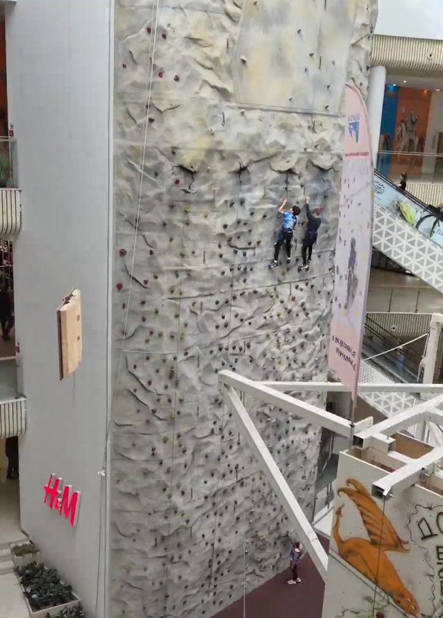 n indoor rock climbing setup inside what appears to be a mall