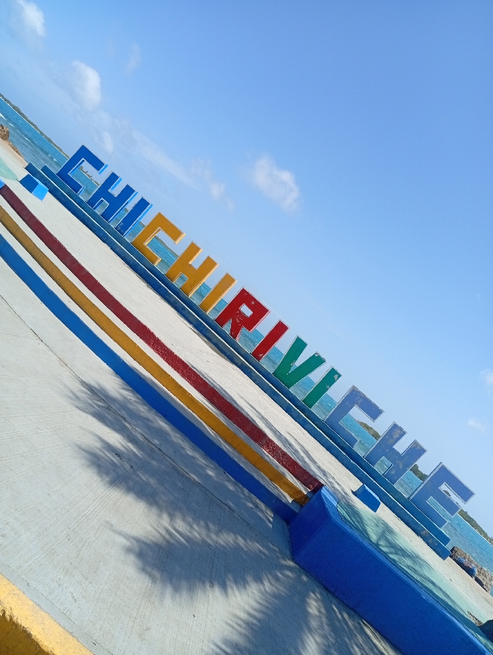 A vibrant sign spelling "CHICHIRIVICHE" stands angled against a bright blue sky with scattered clouds