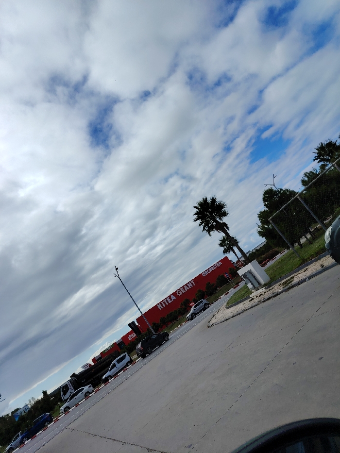 The image depicts a commercial area in Tangier, Morocco, specifically in the vicinity of a KITEA GEANT and Orchestra retail store. The scene is captured at an oblique angle, looking across a paved surface towards a large, predominantly red building under a partially cloudy sky. In the foreground, the lower right corner shows a dark, curved element, consistent with a vehicle's dashboard or steering wheel. The immediate ground is a grey asphalt or concrete surface, likely part of a parking lot or access road, featuring some faint lines. The midground includes a road or multi-lane parking area with several vehicles. From left to right, a dark blue car, a white sedan, a large white truck with a black cargo bed, a white van, a black SUV, a silver sedan, and another dark car are visible. A tall, black lamppost stands upright in the center-left. To the right of the road, a landscaped island with a white curb, sparse green grass, and a white, rectangular electrical utility box is present. Further right, a chain-link fence separates the road from a green area containing several palm trees and other dense foliage. The background is dominated by the large, rectangular commercial building, painted bright red with prominent white lettering. The text "KITEA GEANT" is clearly visible, along with "ORCHESTRA" to its right. The sky above is a mix of dense, white cumulus clouds and patches of clear blue sky, particularly towards the upper right. No individuals are distinctly visible in the scene.