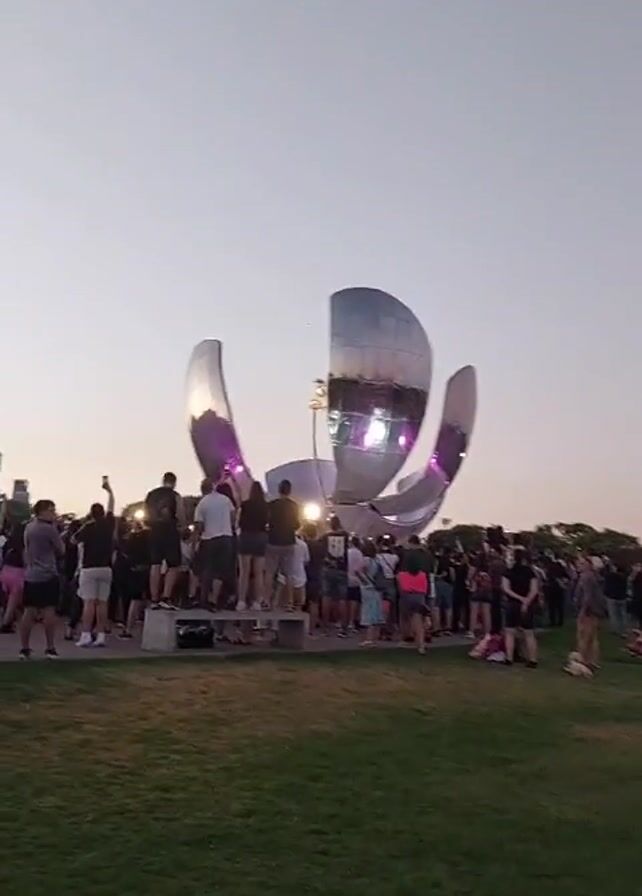 large, mirrored flower sculpture with purple accents at dusk, surrounded by a crowd of people. Some are standing on a raised concrete border, many are on the grass, and a few are taking photos. The sky is a light gradient of colors, and there is a green lawn in the foreground.