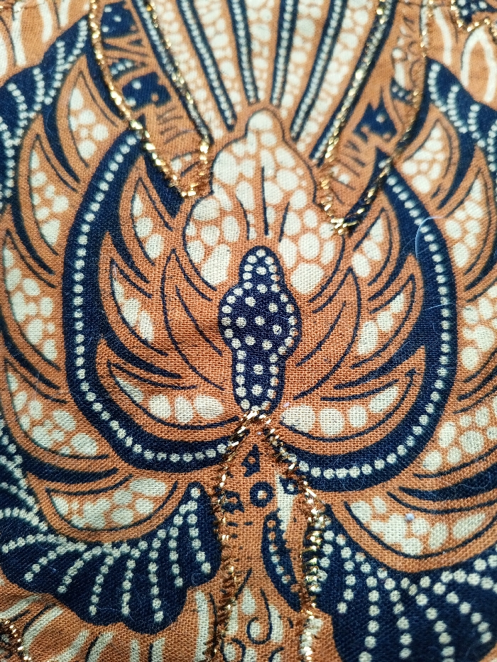 close-up of fabric with a symmetrical design. It features an abstract floral or bird-like pattern in shades of brown, white, and dark blue. Small, regularly spaced dots form outlines and fill certain areas. A shimmering golden thread accentuates the central axis of the design. The texture of the fabric is visible, with a slightly coarse weave. The composition is primarily focused on the central motif, showcasing the details of the pattern.