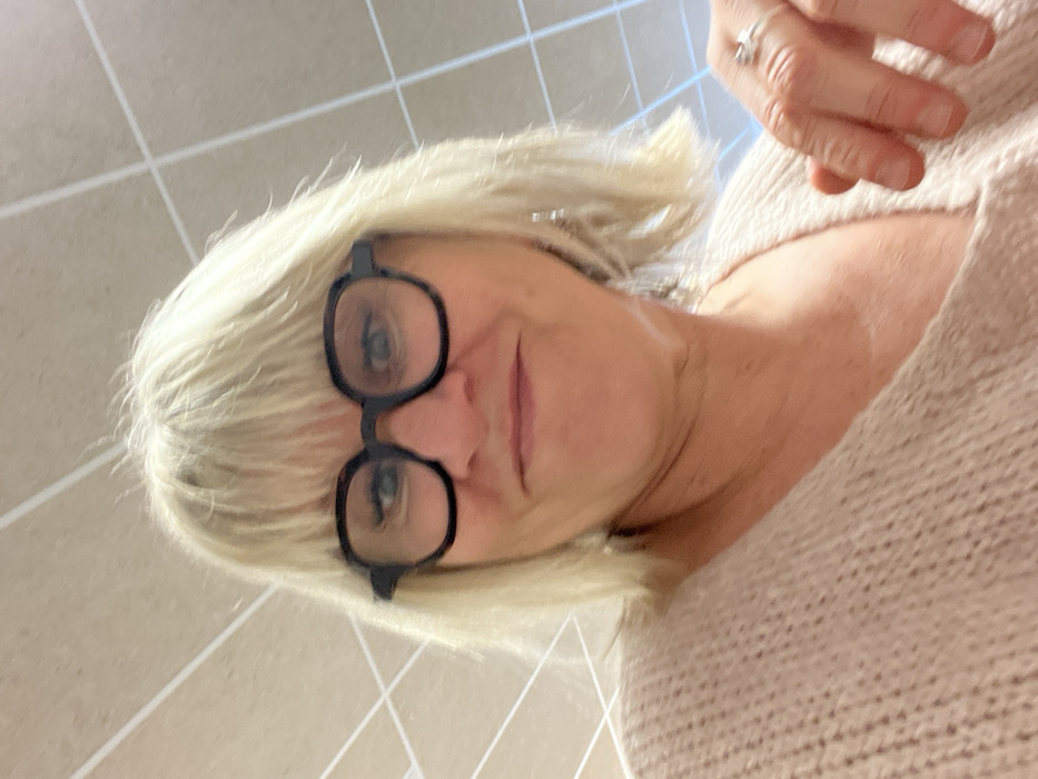 The image captures a close-up, low-angle portrait of an adult female, located in La Fouillouse, France. The subject possesses blonde, shoulder-length hair with bangs, and wears dark, square-rimmed eyeglasses. Her expression is characterized by a closed mouth with downturned corners, conveying a slight smirk or grimace, while her eyes are directed slightly upward through the lenses. She is attired in a light pink, knitted V-neck top. A silver-toned ring with a clear stone is visible on the ring finger of her right hand, which is partially depicted in the lower right foreground. A drop earring is present on her right ear. The background consists of a light-toned ceiling with a visible grid pattern of thin lines.