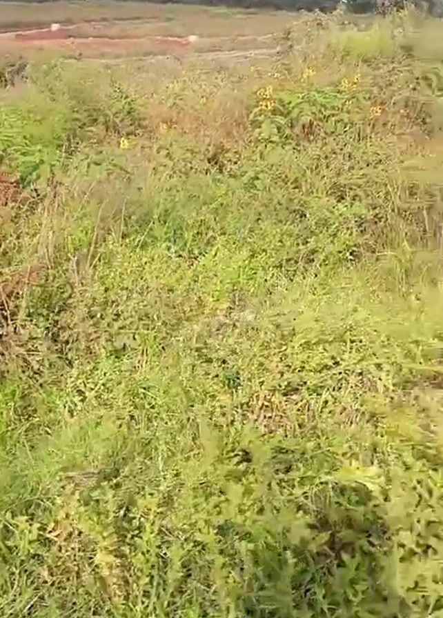 A first person view of a sunlit, grassy field. The camera moves, showing weeds and scattered plants. In the distance, there is a field and trees. The shadow of the camera operator appears briefly.