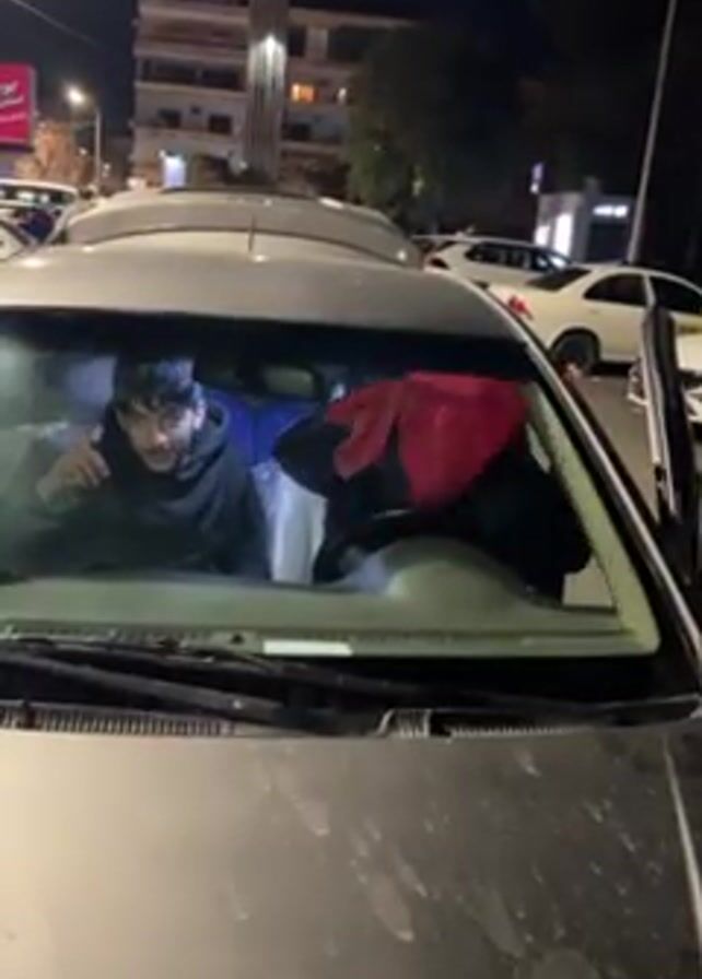 At night, a man sits in the driver's seat of a car parked on a city street. The street is lined with other parked vehicles and buildings with lit windows. The car's windshield is dusty. A second man is visible in the passenger seat. The driver makes a hand gesture, then a red garment is placed over his head, momentarily obscuring his face. He then looks directly at the camera.
