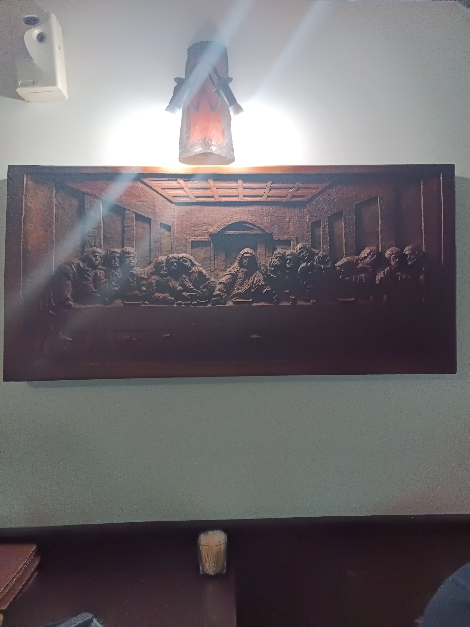 A medium shot captures a bas-relief of the Last Supper hanging on a pale green wall. Above the relief, a light fixture casts a bright glow. To the left of the fixture, a white rectangular object is mounted on the wall. Below the wall and the relief, a dark brown surface is visible. A small glass containing toothpicks sits on the surface to the right of what appears to be a dark red book. The location information indicates this scene is in Lukovit, Bulgaria.